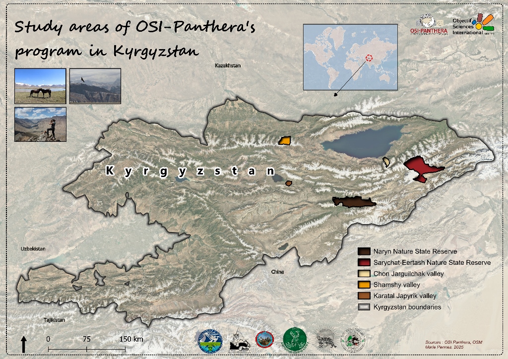 Accompagnée de gardes des réserves, l’équipe arpentera à pied ou à cheval la montagne, ses vallées, pentes et crêtes à la recherche d’indices de présence de la panthère, et d’une manière générale de la faune sauvage des Tien Shan kirghizes…